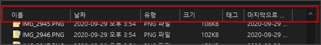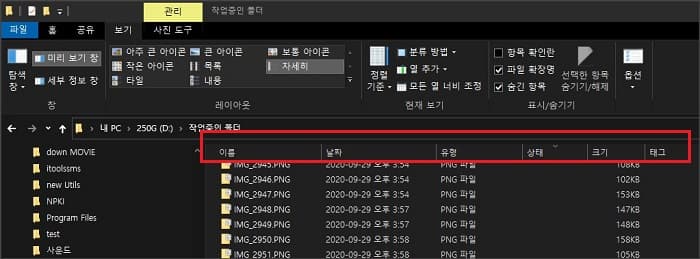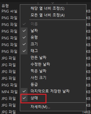 위의 빨간 네모 부분 아무 곳에서나 마우스로 우클릭하면 현재 이 폴더에서 적용 중인 옵션 상태인 날짜, 유형, 크기, 태그, 상태 등이 체크 표시되어 있는 것을 확인할 수 있습니다.