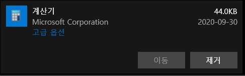 윈도우 계산기가 위의 사진 앱과 다른 점이 있다면 앱 및 기능의 앱 목록에서 클릭해 보았을 때, 제거 버튼이 활성화되어 있다는 점입니다. 사진 앱의 경우에는 활성화되어 있지 않아 고급 옵션에서 제거하는 방식을 취했습니다.