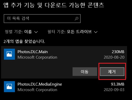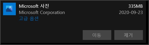 만약 복구나 초기화 버튼을 이용해 상태가 나아지지 않는 다면 새로운 설치를 위해 제거해줍니다. MS 스토어에서 다운로드하여 재설치가 가능하므로 걱정하지 말고 제거하면 됩니다. 다만, 제거가 비활성화되어 있을 경우에는 가장 아래쪽의 하나 또는 두 개의 앱 목록을 누르고 모두 제거해 주시면 됩니다.