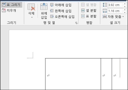 표 제작 도중 칸을 넓히거나 줄이려면 Esc 키를 누른 다음 선에 마우스 커서를 가져다 대고 기존의 하던 방식대로 할 수 있습니다. 다시 그리기 모드로 돌아가려면 표 그리기 버튼을 클릭하면 마우스 커서는 다시 연필 모양으로 바뀌며 그리기 모드로 전환됩니다.