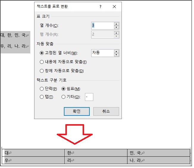 텍스트가 있는 문장을 쉼표나 마침표 등의 사용자가 지정한 기호로 구분하여 문장을 완성한 다음 블록 지정하고 '텍스트를 표로 변환'을 눌러 줍니다. 구분을 의미하는 지정한 기호에 의해 세로 선(열)이 그어지게 됩니다.