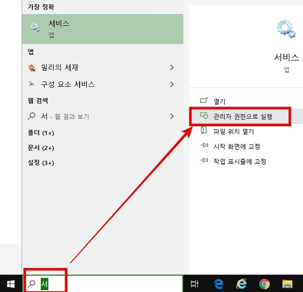 작업 표시줄의 검색란에 서비스라고 입력한 다음 관리자 권한으로 실행합니다.