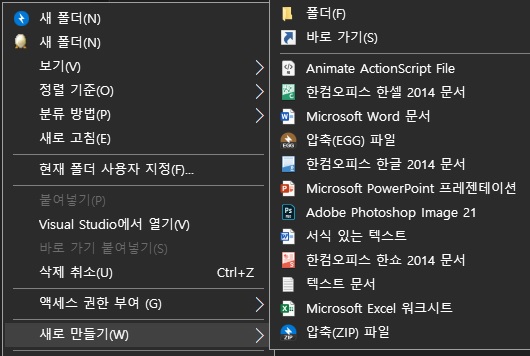 마우스 우클릭시 '새로 만들기'가 보이지 않거나 비활성화된 경우