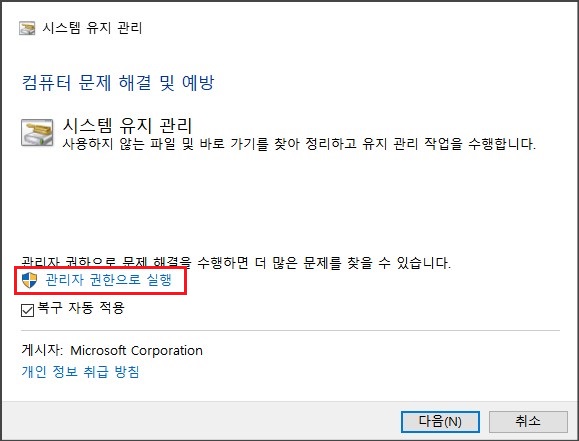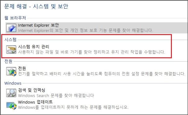 - 제어판 > 문제 해결 > 시스템 보안 > 시스템 유지 관리