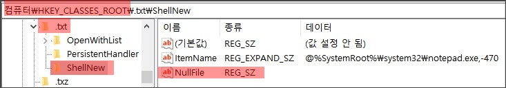 하위 항목 폴더 중 ShellNew 폴더가 없다면 .txt를 우클릭하여 새로 만들기를 한 다음 키를 추가한 다음 이름을 ShellNew로 해줍니다. ShellNew 폴더가 만들어 졌으면 다시 ShellNew 폴더를 우클릭하여 새로만들기를 한 다음 문자열 값을 추가해 주고 이름은 NullFile이라고 적어줍니다. NullFile에서 입력할 내용은 없습니다.