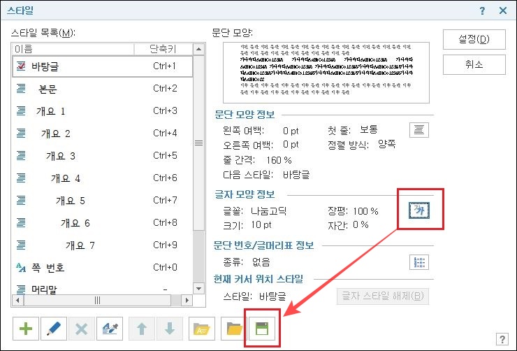 스타일 설정 창에서 글자 모양 정보 항목의 우측에 있는 사각형 '가'라고 되어 있는 아이콘을 클릭한 다음 글꼴, 크기, 장평, 색상 등을 설정해 줍니다. 그다음 하단의 디스켓 모양의 저장 아이콘을 누르면 스타일 내보내기 창이 뜹니다.