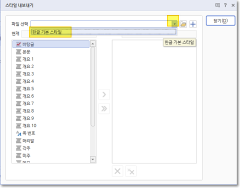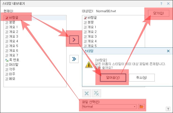 스타일 내보내기 창에서 가장 먼저 하단에 있는 파일 선택 부분을 클릭하고 Normal을 선택해 줍니다. 그 다음 바탕 글 부분을 클릭하고 가운데의 화살표 한개짜리를 클릭한 다음 팝업창에서 덮어씀 버튼을 눌러주고 닫기를 눌러 스타일 내보내기 창을 닫습니다. 저장할 거냐고 한번 더 물어보는데 저장을 눌러줍니다. 나중에 원할 경우에는 초기화가 가능하므로 신경 쓰지 않으셔도 됩니다.