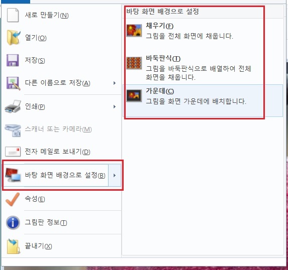 상단의 파일 메뉴를 누르고 드롭 다운 메뉴에서 '바탕 화면 배경으로 설정'을 클릭한 다음 채우기, 바둑판식, 가운데 등의 바탕화면 배경 옵션까지 지정해 줄 수 있습니다.