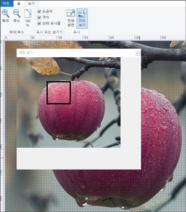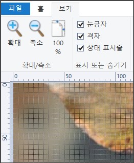 마치 포토샵에서 쓰는 것과 같은 격자와 눈금자를 표시하게 하거나 숨길 수 있습니다. 그림판의 상태 표시줄의 표시 또는 숨기기도 여기에서 설정합니다.