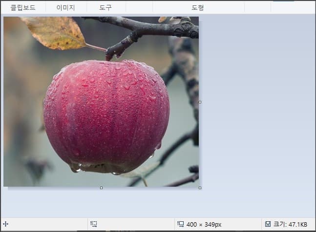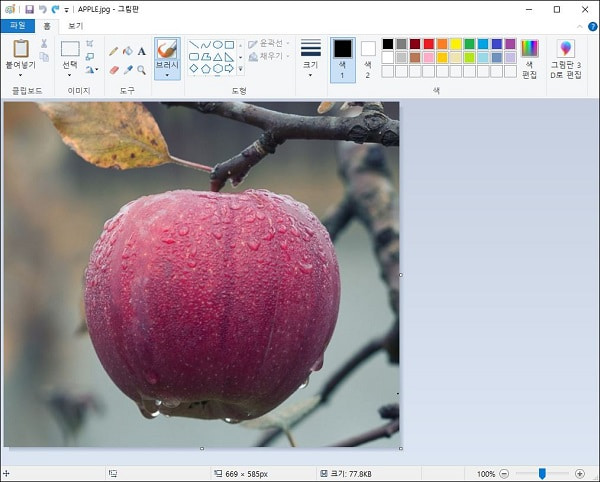 예제 파일로 잘익은 사과를 불러옵니다. 아무거나 불러와서 연습하셔도 됩니다. 아래의 그림판 상태 줄에서 보면 가로 669픽셀, 세로 585픽셀 크기의 이미지이며, 파일크기는 77KB라는 사실을 볼 수 있습니다. 그 옆의 100% 바는 드래그하여 편집 화면을 크게 보거나 작게 볼 수 있는 조절장치로 실제 적용되는 것이 아니라 작업에 편리하도록 도와주는 보조툴입니다. 좌우로 드래그하면 12.5%부터 800%까지 이미지 보기 비율을 증감할 수 있습니다.