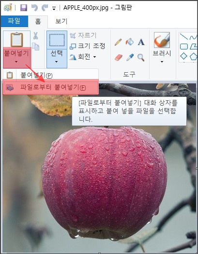 이미지 속에 이미지를 넣기 기능입니다. 상단의 붙여 넣기를 클릭한 후 '파일로부터 붙여 넣기'를 클릭한 다음 붙여 넣을 이미지를 선택해 주면 선택된 이미지가 들어가게 됩니다.