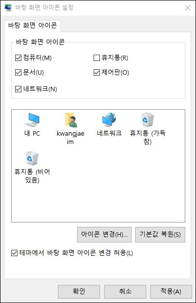 윈도우 설정에서 개인설정의 테마 항목을 열고, 오른쪽에 있는 항목 중 아래쪽에 있는 바탕화면 아이콘 설정을 클릭합니다. 설정창에서 기본값 복원을 눌러준 다음 보이게 하고 싶은 아이콘들에 체크 표시합니다.