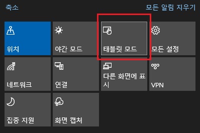 데스크톱이나 노트북에서 윈도우 설정이 태블릿 모드로 적용되어 있는 경우에는 바탕화면의 아이콘 표시가 제대로 이루어지지 않을 수 있습니다. 작업표시줄의 우측에 있는 알림 센터를 클릭한 다음 태블릿 모드를 끕니다.