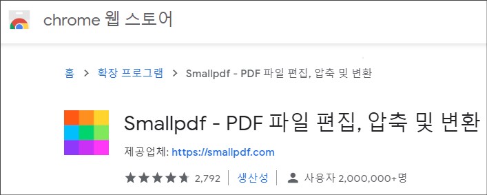 검색란에 Smallpdf라고 입력하여 검색한 다음 결과물 중 제공업체 주소가 smallpdf.com인 앱을 찾습니다. 해당 앱을 클릭하여 크롬 설치 과정을 진행합니다.