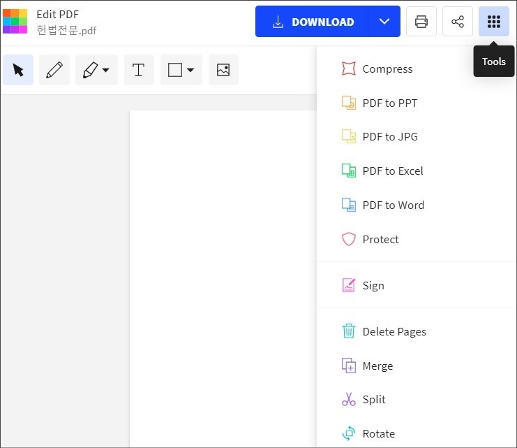 저장은 상단의 파란색 다운로드 버튼을 누르면 편집된 PDF 파일이 다운로드되는 방식입니다.
