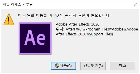4. 파일 액세스 거부됨 창의 관리자 권한 계속 요구를 계속을 눌러 승인해 줍니다.