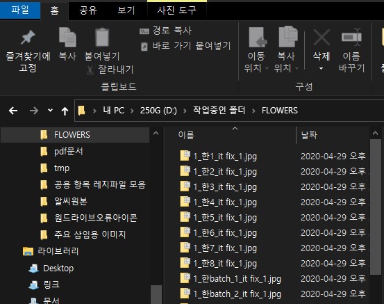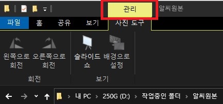 2. 상단의 메뉴중 관리 > 사진 도구 탭을 클릭합니다. 사진 도구 탭은 이미지 파일이 있는 폴더로 이동하면 자동으로 활성화되어 나타납니다.