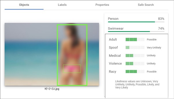 세전째는 수위를 조금 더 높여 보았습니다. 비키니를 입은 해수욕장에서 찍은 일반인 사진이었는데 테스트 화면 조차 올릴 수 없었습니다. 해수욕장 비키니 사진의 원본을 테스트한 사진조차도 결과 값이 포함되어 있는 데도 불구하고 거의 원본과 비슷한 판정을 하였습니다.