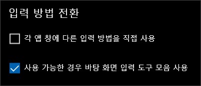 3. 키보드 설정 페이지에서 입력 방법 전환 항목의 '사용 가능한 경우 바탕 화면 입력 도구 모음 사용'에 체크합니다.