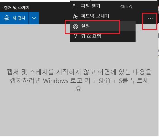 눌렀을 때 실행되는 창에서 오른쪽 상단의 3점을 누르면 스크린 캡처와 관련된 많은 설정을 할 수 있습니다. 윈도우 설정을 비롯해서 사각형 캡처 시 테두리 선을 넣을지 안 넣을지와 두께, 색상 등도 여기서 설정합니다.