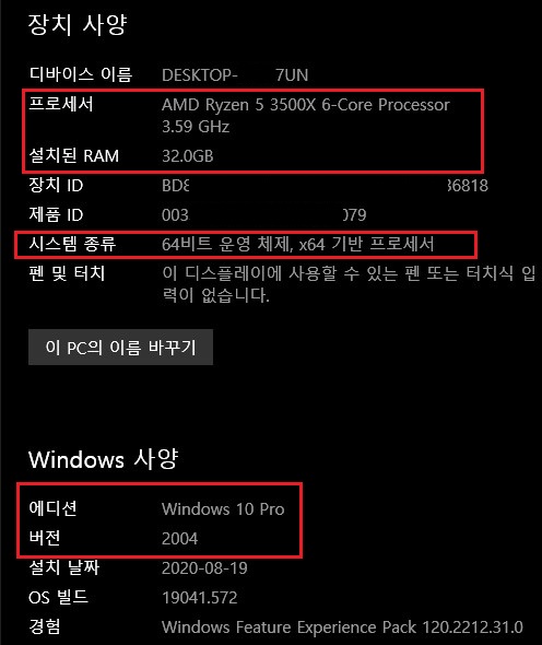 여기에서 볼 수 있는 정보들로는 컴퓨터 이름, CPU 모델명, RAM 용량, 시스템 비트, 설치된 윈도우의 종류 및 버전 등의 정보를 볼 수 있습니다.
