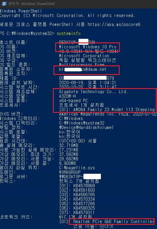 여기서 얻을 수 있는 정보는 윈도우 종류 및 버전, 윈도우를 사용중인 MS에 등록된 계정 이메일 주소, 메인보드 칩셋 제조사 및 모델명, CPU 제조사, 바이오스 제조사 및 버전, 실제 메모리와 가상 메모리 용량, 랜카드 이름, ip 주소(일반적으로 외부 ip가 아닌 사설 내부 ip주소임) 등의 정보가 출력됩니다.