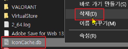 위의 경로로 들어간 다음 아래로 스크롤 바를 내리면 iconcache.db라는 파일이 보입니다. 해당 파일을 삭제합니다.