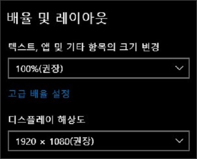 바탕화면 우클릭 디스플레이 설정 > 배율 및 레이아웃에서 텍스트, 앱 및 기타 항목의 크기를 사용자 지정 인수 설정하지 않고 권장 설정을 채택합니다. 또한, 디스플레이 해상도도 권장 해상도를 채택합니다.