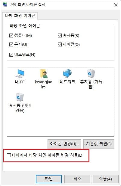 하단의 테마에서 바탕 화면 아이콘 변경 허용 옵션의 체크 표시를 해제합니다. 그런 다음 하단의 적용 및 확인 버튼을 누릅니다.