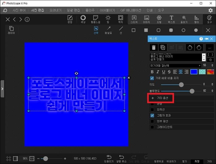 마지막으로 행간 및 자간을 조절하고 그림자 효과의 옵션을 적절하게 조절한 최종 모습은 아래와 같으며 먼저 Psxprj라는 확장자를 가진 프로젝트 파일로 저장해 둡니다. 이렇게 해 두면 훗날 이 파일만 불러와 글씨만 다른 글로 써넣고 저장하면 다른 배너를 쉽게 만들 수 있습니다. 반사광은 그림자 효과에서 외부 광선으로 변경하고 저장하였습니다.