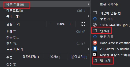 이후 방문 기록을 선택하면 하위 메뉴에서 탭 00개 이런 메뉴가 한두 개 보입니다. 그걸 모두 클릭해 주면 바로 이전에 여러 개의 탭이 열려 있던 크롬 창이 그때 그 모습 그대로 다시 실행됩니다.