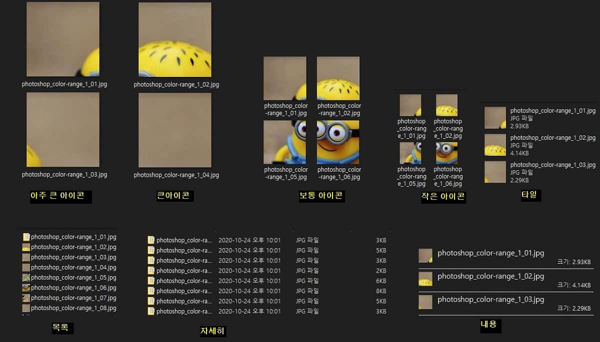 윈도우에서 파일 탐색기를 열고 이미지들이 모여 있는 폴더를 열어 볼 경우에 보기 탭을 클릭하면 폴더 내의 이미지들이 특정 형식으로 지정되어 있음을 볼 수 있습니다.