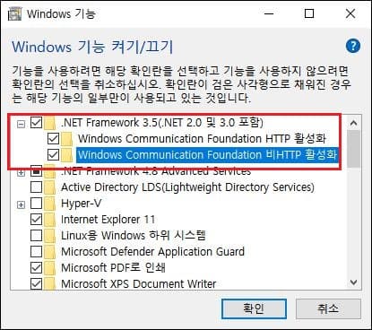 가장 상단의 .NET Framework 3.5의 좌측 더하기 표시를 클릭하여 하위 옵션들을 연 다음 모두 선택해 줍니다. 그런 다음 하단의 확인을 눌러줍니다.