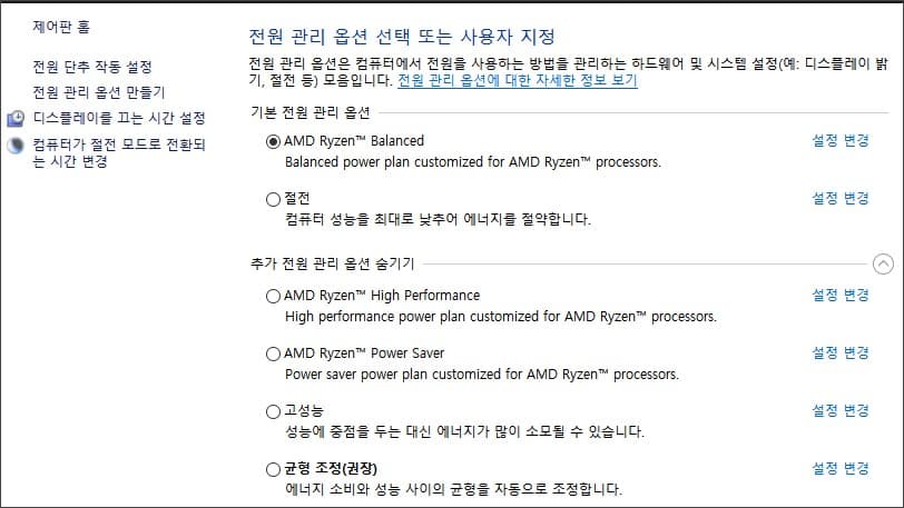 좌측의 '컴퓨터가 절전 모드로 전환되는 시간 변경'을 클릭하여 고급 전원 관리 옵션 설정 변경으로 들어간 후 '기본값 복원' 버튼이 활성화되어 있다면 기본값으로 적용해 보시기 바랍니다.