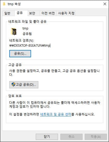 공유 폴더를 우클릭한 다음 속성을 선택합니다. 속성에서 공유 탭을 클릭한 다음 공유 또는 고급 공유 항목 그리고 하단의 네트워크 및 공유 센터 항목의 설정이 올바른지 검토하시기 바랍니다.