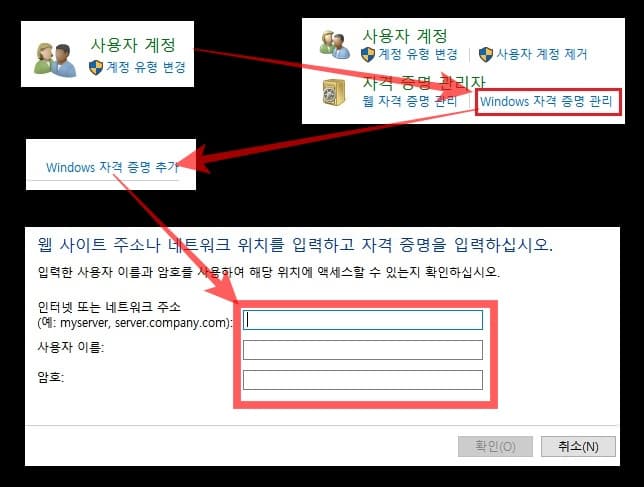 공유폴더가 위치한 PC에서 제어판을 열고 사용자 계정-Widows 자격 증명 관리-Windows 자격 증명 추가를 차례로 클릭한 다음 마지막 입력 폼에서 PC 이름 또는 ip 주소, 추가해줄 클라이언트 PC의 이름과 암호를 지정해 줍니다.