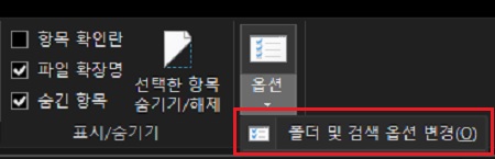 파일 탐색기의 상단 메뉴의 우측 끝에 있는 옵션을 클릭하고, 폴더 및 검색 옵션 변경을 선택합니다.