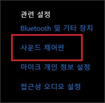 윈도우 설정의 소리 설정 페이지가 열리면 우측의 관련 설정 항목 중 사운드 제어판을 클릭합니다.