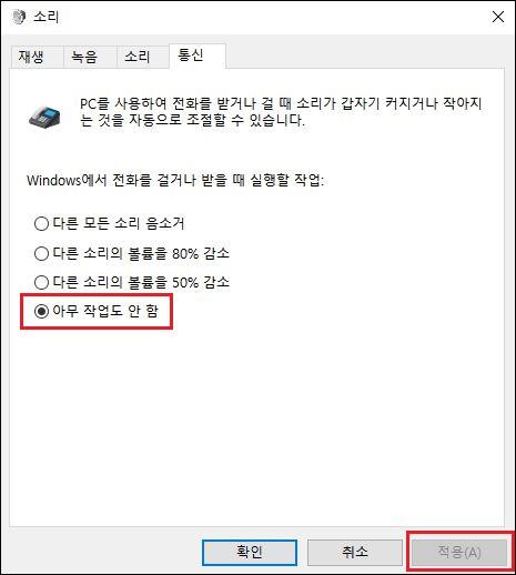 사운드 제어판이 열리면 통신 탭을 클릭합니다. 통신탭에서 아무 작업도 안 함을 선택해 준 다음 적용 및 확인 버튼을 눌러 줍니다.