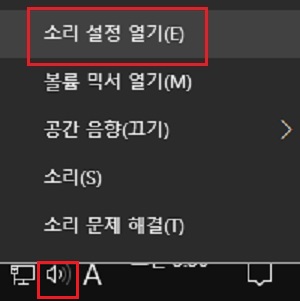 작업 표시줄의 알림 영역에 있는 스피커 아이콘을 우클릭한 다음 소리 설정 열기를 클릭합니다.