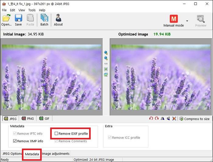 탐색기에서 만든 이미지에 대한 태그를 보존하면서 용량을 줄이려면 Remove EXIF profile의 체크 표시를 해제하면 됩니다. 이렇게 하면 이미지 파일의 메타 태그를 보존하면서 용량을 줄이게 됩니다.