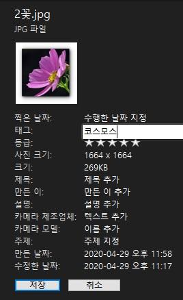 그래픽 프로그램마다 이미지 편집 후 저장할 경우에 태그 삽입을 지원하는 것과 지원하지 않는 것들이 다 제각각입니다. 하지만, 윈도우가 깔려있는 PC가 있다면 누구나 설치되어 있는 파일 탐색기에서 간단히 이미지 태그를 삽입할 수 있습니다.