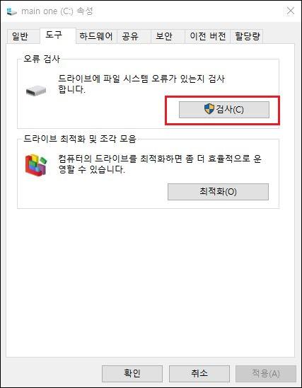 파일 탐색기에서 윈도우가 설치된 드라이브를 마우스 우클릭한 다음 드스크 정리 및 오류 검사 등을 진행합니다. 윈도우 에서는 오류가 발견되는 경우 자동으로 복구를 진행합니다.