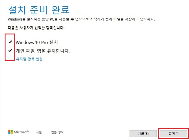 개인 파일 유지가 선택된 상태 그대로 설치를 시작합니다.