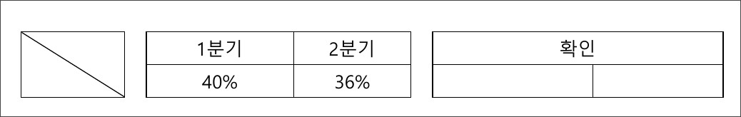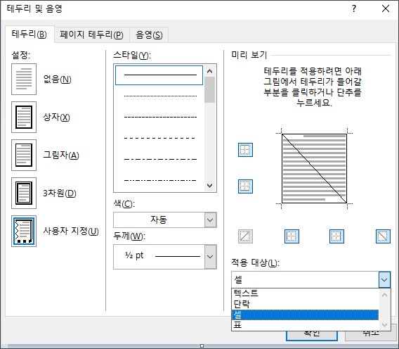 1행 1열과 2행 1열이 합쳐진 셀을 블록 지정한 상태에서 상단 메뉴 중 디자인 > 페이지 테두리를 선택합니다. 테두리 및 음영 옵션 창에서 테두리 탭을 선택한 다음 우측에 있는 사선 아이콘을 클릭하면 좌상단에서 우하단으로 그어지는 사선이 만들어집니다. 하단의 적용 대상은 셀을 선택해야 합니다.