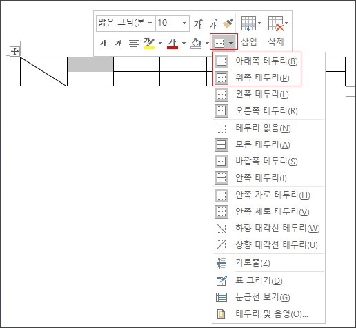 드롭다운 메뉴에서 위와 아래의 테두리를 한 번씩 선택해 줍니다.