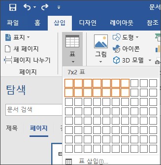 MS 워드를 열고 상단 메뉴중 삽입의 표를 드래그하여 두줄에 7칸짜리 표에서 클릭합니다.