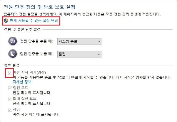 이렇게 하면, 선택할 수 없었던 빠른 시작 켜기의 체크 표시를 해제할 수 있습니다.