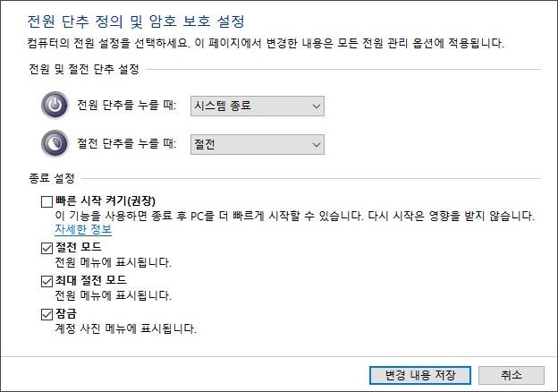 - 제어판 > 전원 옵션 > 전원 단추 작동 설정