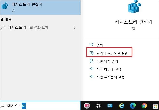 윈도우 작업표시줄의 검색창에 레지스트리라고 입력하고 관리자 권한으로 레지스트리 편집기를 실행합니다.